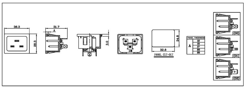 Standard: IEC 60320 C20 Rating: 20A 250V AC / 16A 250V AC Insulation Resistance: 100MΩ 500V DC / 1 minute Dielectric Strength: 2000V AC / 1 minute Housing Material: Thermoplastic 94V-2~V-0