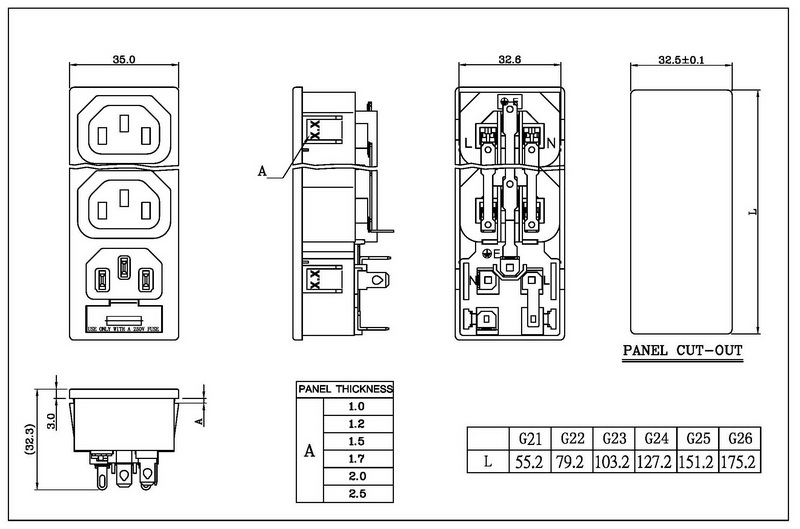 Standard: IEC 60320 C14 & F Rating: 15A 250V AC / 10A 250V AC Insulation Resistance: 100MΩ 500V DC / 1 minute Dielectric Strength: 2000V AC / 1 minute Housing Material: Thermoplastic 94V-2~V-0