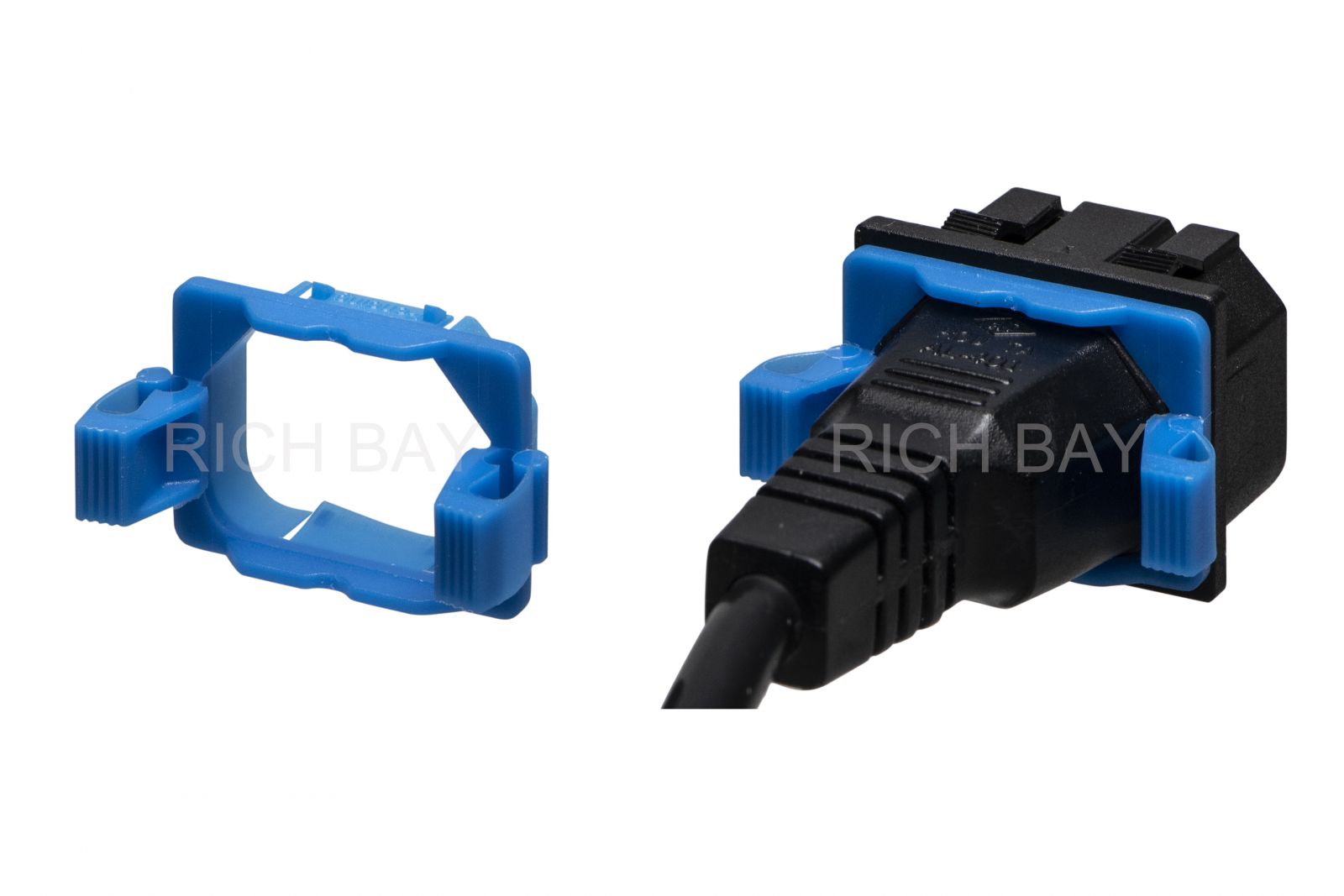 Richbay PLIC13 plug-lock inserts prevent accidental disconnection of C14 power cord from C13 outlets.