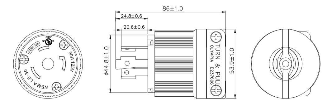 Part number: WJ-8330 Specification:30A 125V AC 2Pole 3Wire Grounding Locking Plug, NEMA L5-30 Certifcation: UL