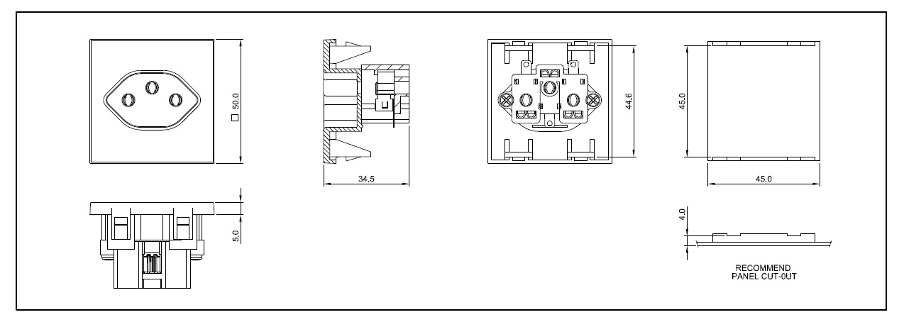 Rating: 10A 250V AC Insulation Resistance: 100MΩ 500V DC / 1 minute Dielectric Strength: 2000V AC / 1 minute Housing Material: Thermoplastic 94V-2~V-0 Part No. :RW-02(B200)